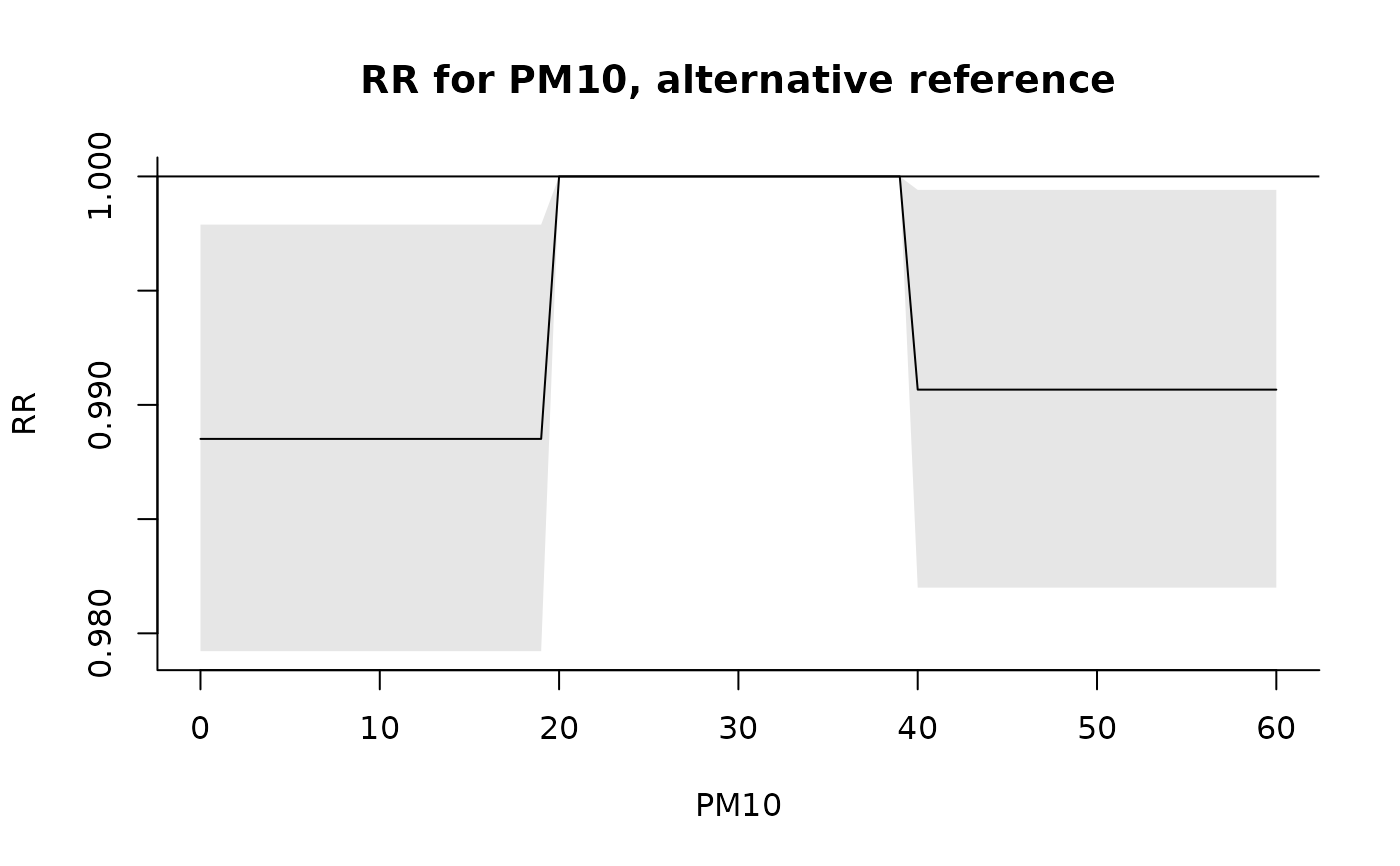 plot(pred, xlab="PM10", ylab="RR", main="RR for PM10, alternative reference")