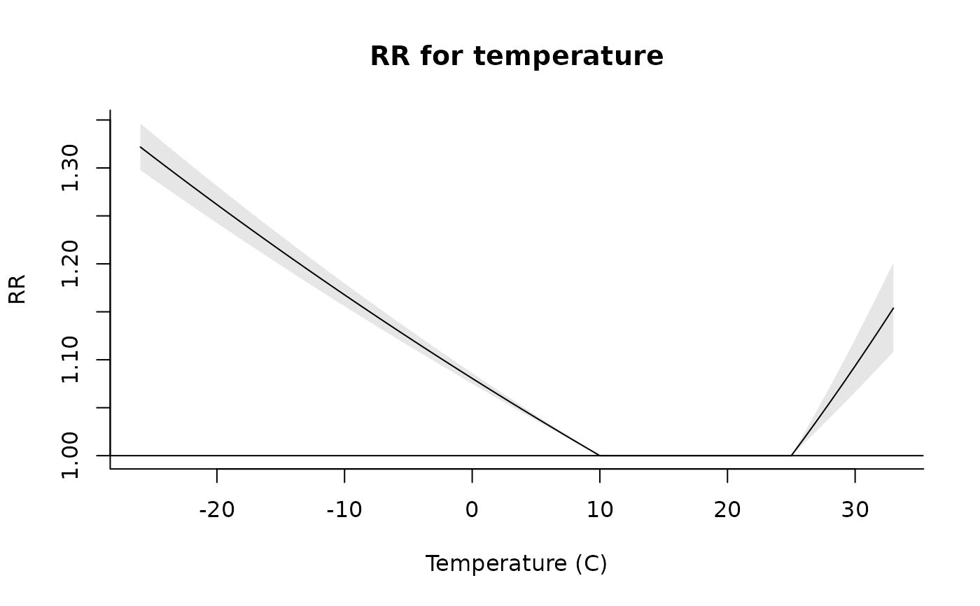 plot(pred, xlab="Temperature (C)", ylab="RR", main="RR for temperature")